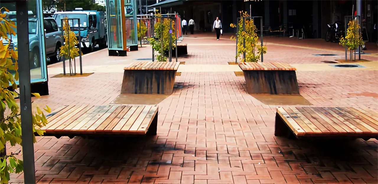 Wellington's ubiquitous terracotta tiling is out in full force. This, more than anything, enables the park to act as an extension of the footpath. While this is certainly in-line with the park's goals – would a greater variety in the ground plane be too much to ask? Even a minor substitution of the secondary tan brick would go a long way to creating more of a unique sense of place. ...Sleek and simple in their elongated S-shape, the seat/bench hybrids echo the rustic materiality that has populated the waterfront. Since their Ghuznee debut, they have gained a softer timber seat-cover, as well as map-etchings and swiss-cheese punctures that add character to the design. I have to admit, my first reaction to the design was: wait, can I stand on these things?