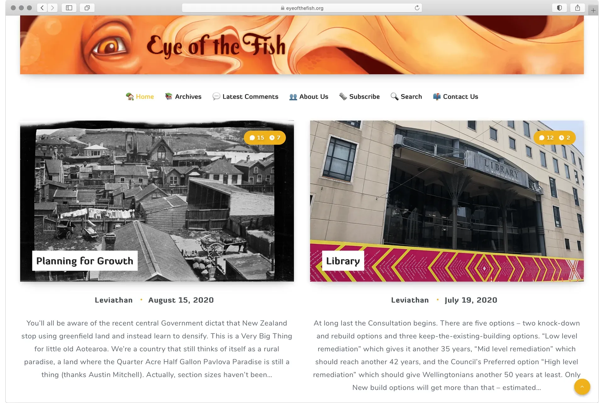 The Eye of the Fish is a blog focused on the urban environment of Wellington, New Zealand. It is now in its twelfth year running and host to over 900 posts and 10,000 comments.